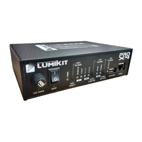 A interface Lumikit PRO X4i destaca-se pelas inúmeras possibilidades de configuração, 4 saídas DMX com isolação, alta velocidade (até 44 FPS em todas as saídas DMX), uma das saídas pode ser convertida em entrada DMX e a possibilidade de gravação das cenas em um Pen Drive para posterior reprodução.